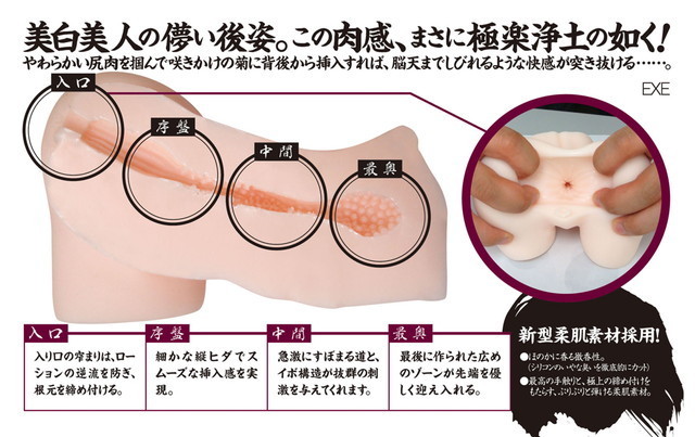 しなやかな腰。たわわな双丘から菊華へ・・・。絶景フォルムを匠が再現! 高級素材を贅沢に使用した重量570g。大腿部の付け根まで完全に再現されたホール形状は、どこまでリアルに近づくのか驚愕の仕上がり。